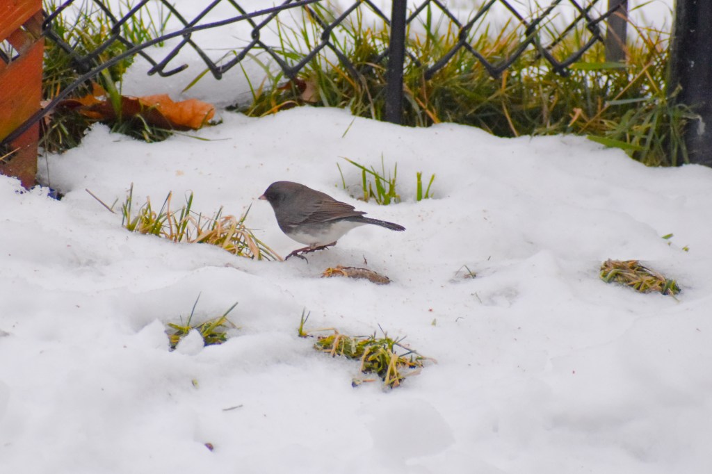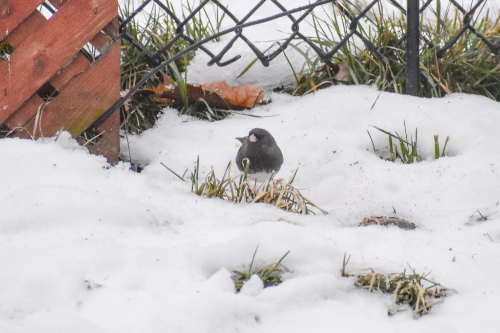 Finally, the visitor was identified, well after it had left safely though. It was a Dark-eyed Junco. It was a male adult Junco from what I managed to learn about the cute little bird. They are quite common in Canada and referred to as ‘snowbirds’, evidently. Its the first time I’ve come across this bird in the backyard. Hopefully get to see them soon and capture these beauties closeup in greater detail. I will stop writing at this point and share a few clicks I managed of our unscheduled but rather special meeting today 😊