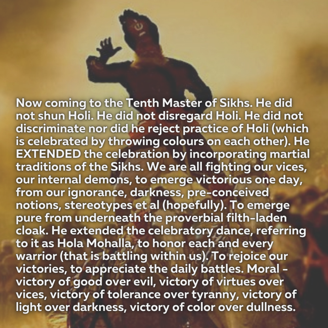 Now coming to the Tenth Master of Sikhs. He did not shun Holi. He did not disregard Holi. He did not discriminate nor did he reject the practice of Holi (which is celebrated by throwing colors on each other). He EXTENDED the celebration by incorporating the martial traditions of the Sikhs. We are all fighting our vices, our internal demons, to emerge victorious one day, from our ignorance, darkness, pre-conceived notions, stereotypes et al (hopefully). To emerge purely from underneath the proverbial filth-laden cloak. He extended the celebratory dance, referring to it as Hola Mohalla, to honor each and every warrior (that is battling within us). To rejoice in our victories, to appreciate the daily battles. Moral – the victory of good over evil, the victory of virtues over vices, the victory of tolerance over tyranny, the victory of light over darkness, the victory of color over dullness.